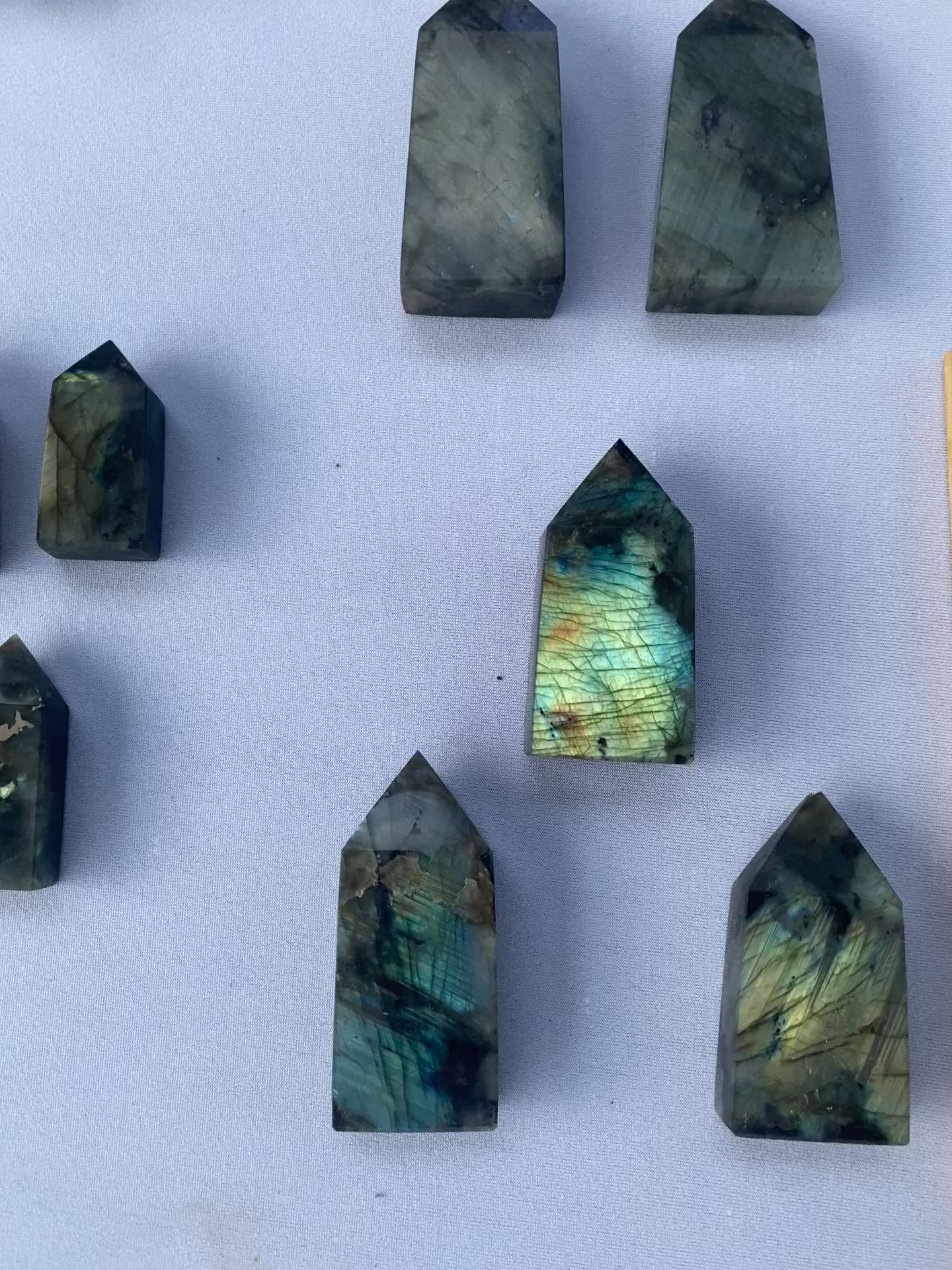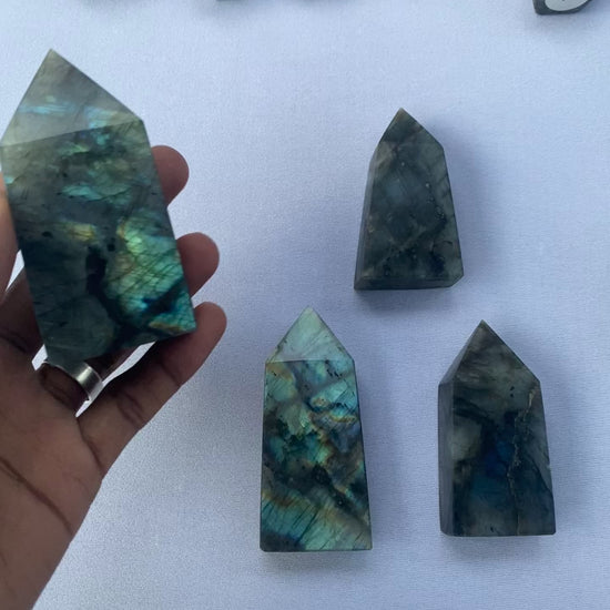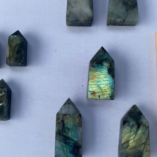 High-quality labradorite towers are captivating specimens, celebrated for their intense play of color and striking form. Each tower is meticulously crafted to enhance the stone's natural iridescence, revealing vibrant flashes of blue, green, gold, and sometimes even purple and orange. These towers not only serve as stunning decorative pieces but are also believed to possess metaphysical properties, promoting clarity, intuition, and transformation. Ideal for collectors and those seeking a touch of natural elegance and spiritual depth in their environment.