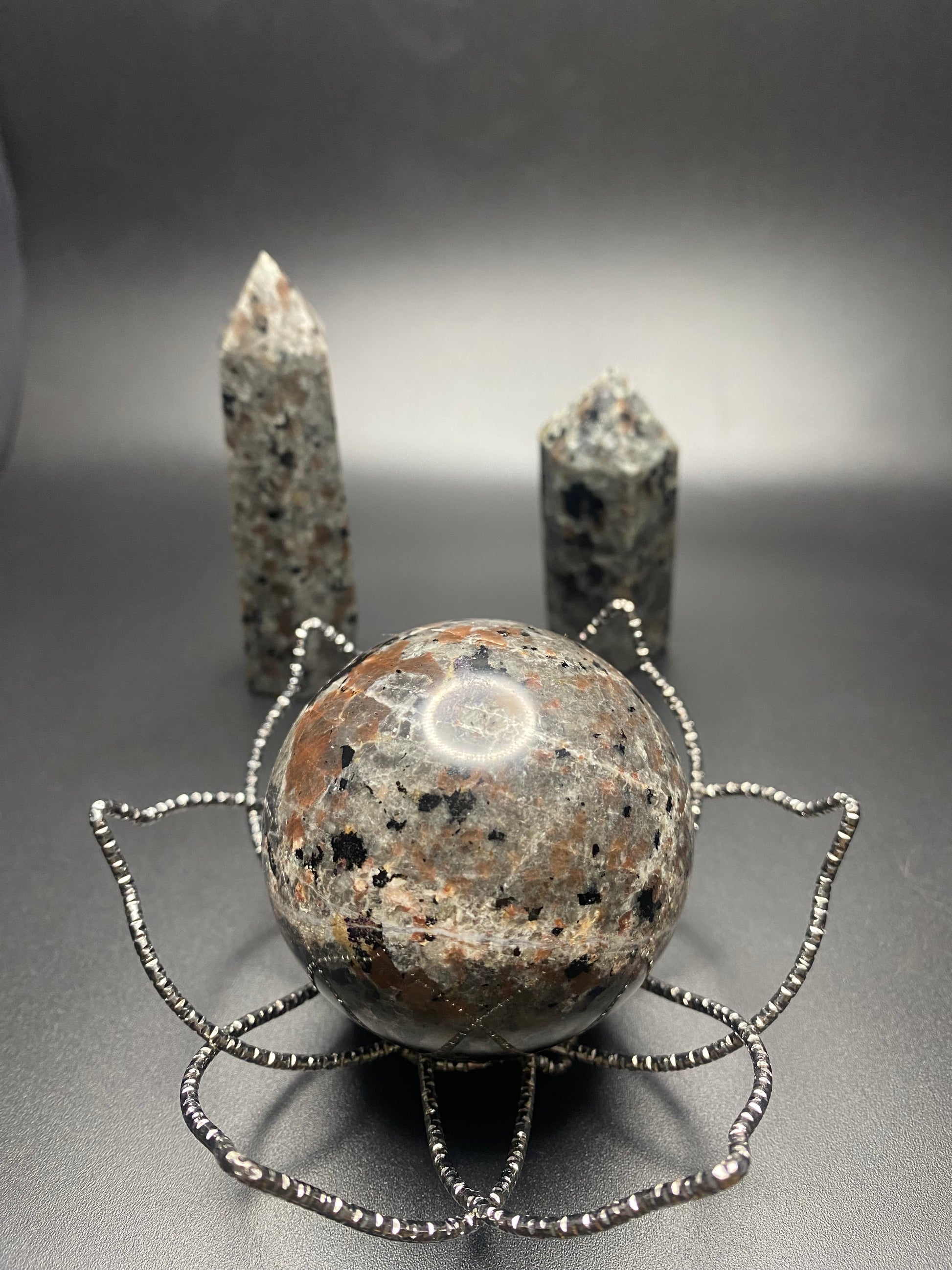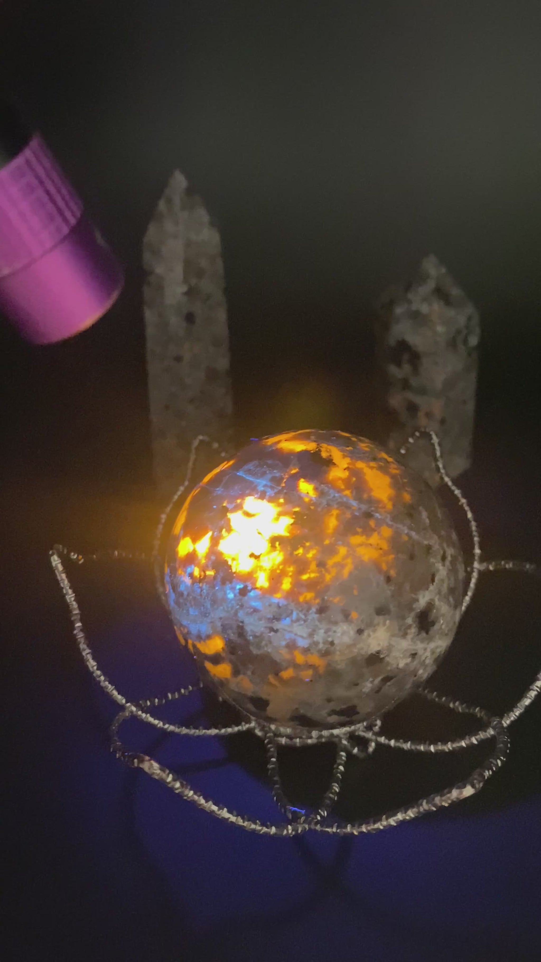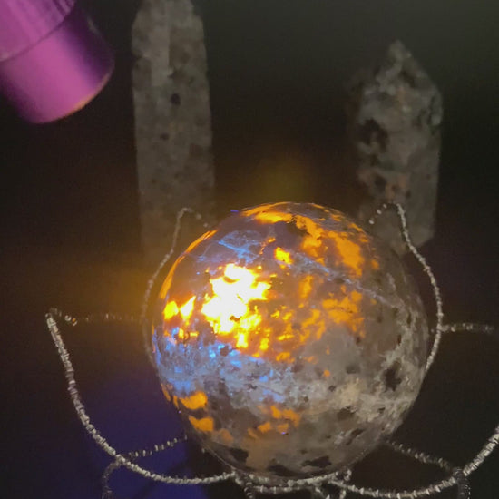 Discover the mesmerizing beauty of UV reactive Yooperlite obelisks & sphere. These stunning stones, found exclusively in Michigan's Upper Peninsula, are a unique type of syenite rock that contains fluorescent sodalite. When exposed to UV light, these obelisks come to life, glowing brilliantly with vibrant hues of orange and yellow. Perfect for collectors, crystal enthusiasts, or anyone looking to add a touch of magic to their space, these Yooperlite stones are a captivating blend of natural wonder and geological rarity. Illuminate your collection with the enchanting glow of Yooperlite and experience the wonder of nature's hidden treasures.